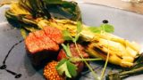 「牛ロース肉のグリエと塩焼きポテト ジュードブッフとバルサミコ ~岩塩焼きしたポテトに彩り野菜~」です。