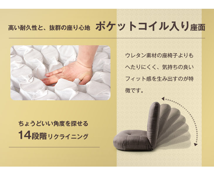 - ポケットコイル内蔵:身体を点で支える構造になっているので、長期間・長時間座っても長く使える!